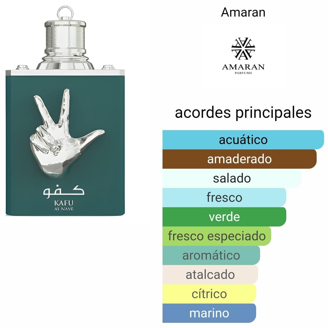 Kafu Al Nasr – Amaran es una fragancia que ejemplifica la frescura refinada, mezclada con un corazón gourmand ligero y una base cálida que proporciona carácter. Desde el principio, la combinación de notas verdes, toques acuáticos, menta y jengibre produce una apertura vibrante, limpia y energizante, como un baño de rocío al amanecer.